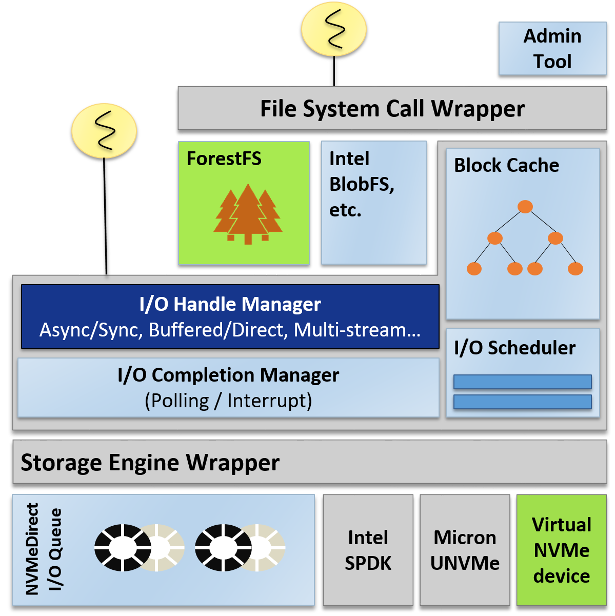 ForestDB is a key-value storage engine we have developed in collaboration with Couchbase Inc. ForestDB uses a new hybrid indexing scheme called HB+Trie which allows for efficient indexing and retrieval of arbitrary length string keys. We are currently working on a version of ForestDB called ForestDB-raw that works on the raw block device. We plan to use ForestDB-raw in implementing a user-level file system for NVMeDirect and a storage engine for Ceph distributed storage system.